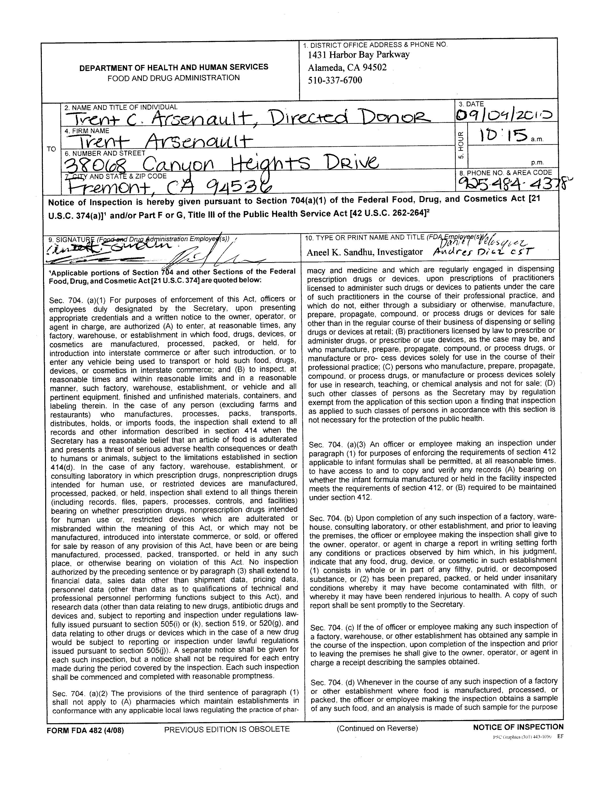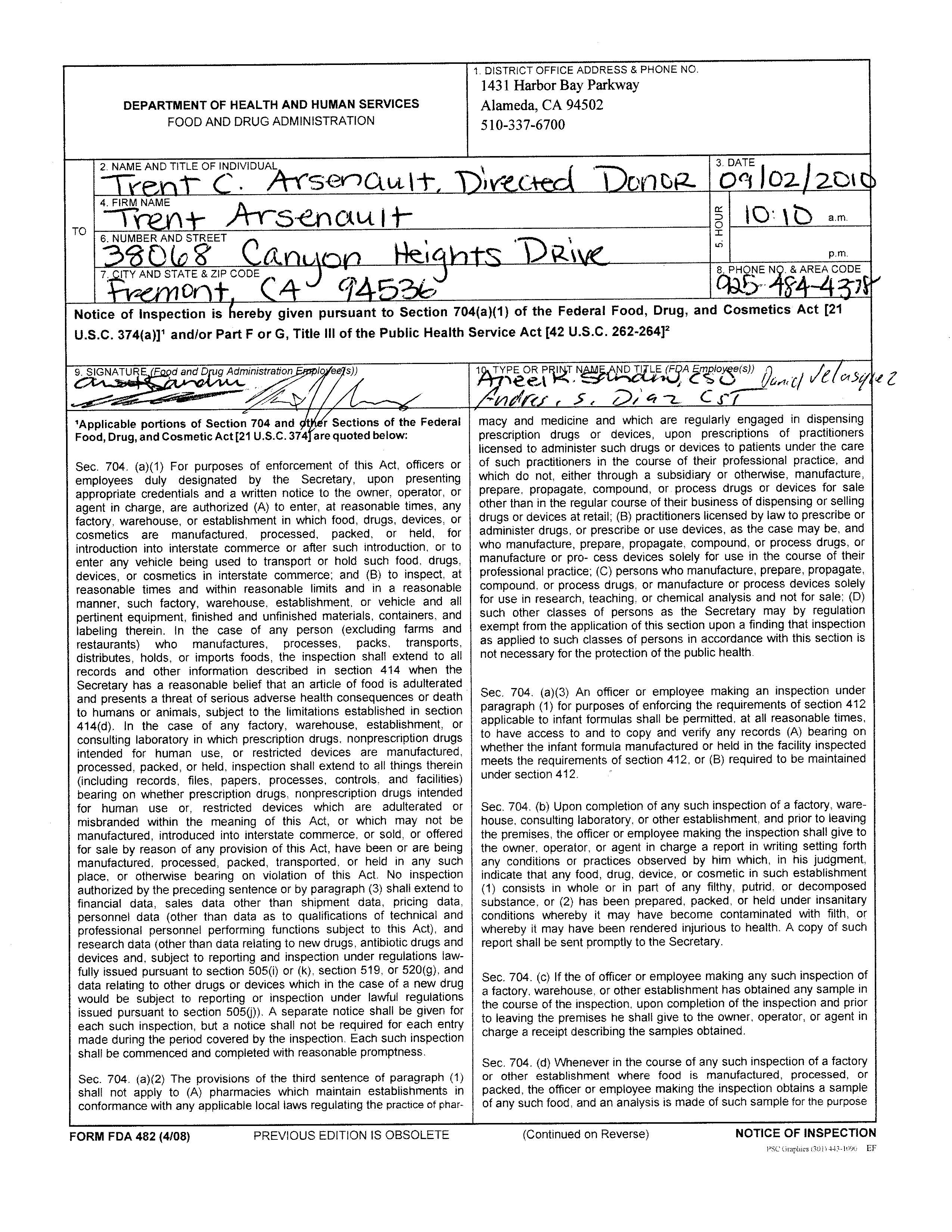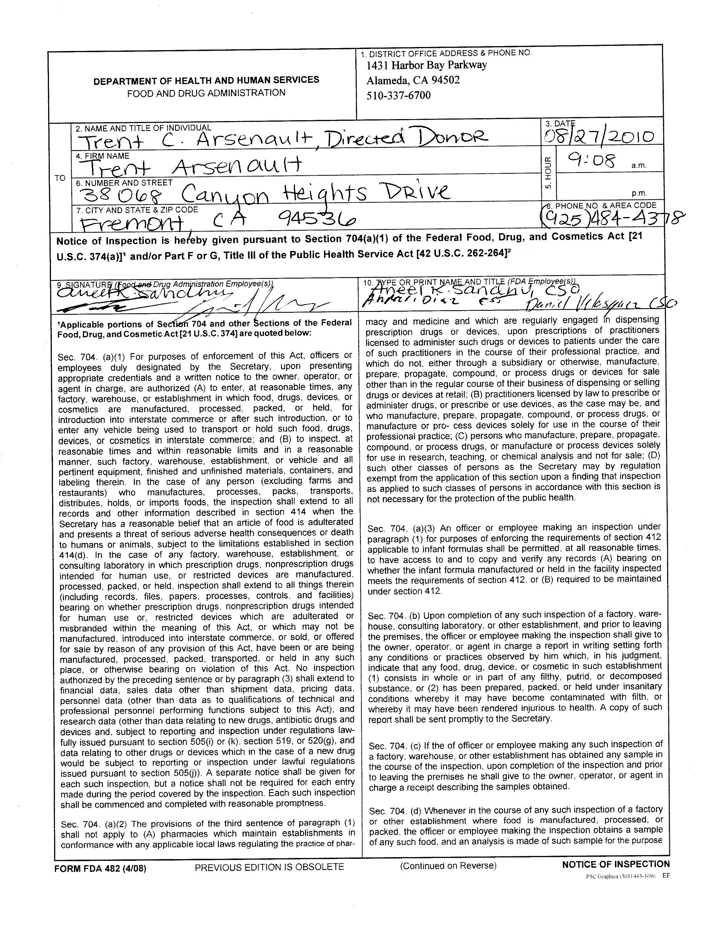 FDA Form 482 (4 total) issued during each inspection visit - Aug - Sep, 2010 - 8 pages