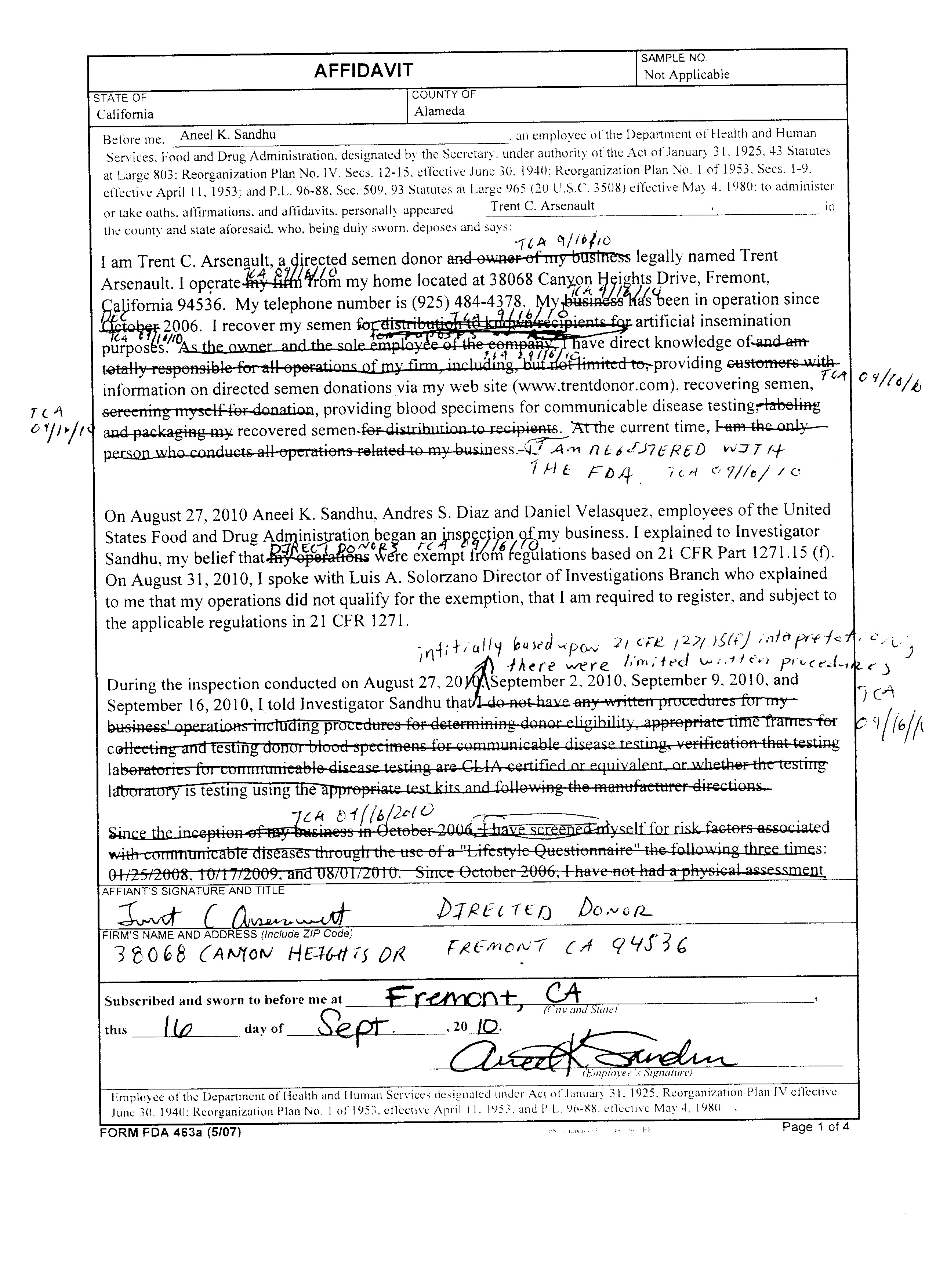 Form FDA 463a Signed Affadavit - 16-Sep-2010 - Page 1 of 4