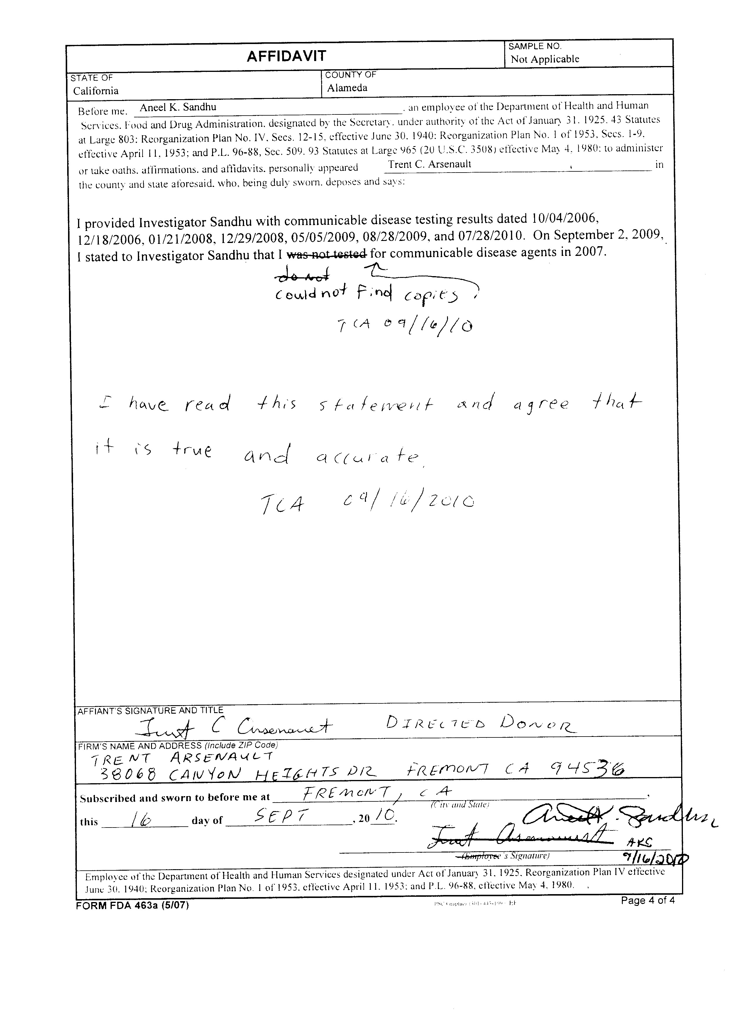 Form FDA 463a Signed Affadavit - 16-Sep-2010 - 4 Pages